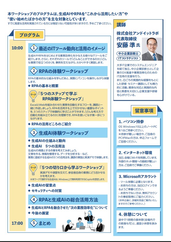 生成AIやRPAのツールを実際に操作していただき、初心者でも「業務に活用できる!」という実感を持てるような体験型のプログラムを提供します。